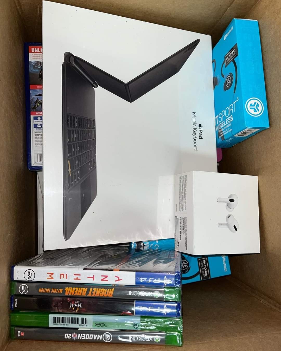 The Amazon electronic mystery box contains a lot of electronics such as iPhones, airpods, controllers, music players charger ps5 and many other accessories